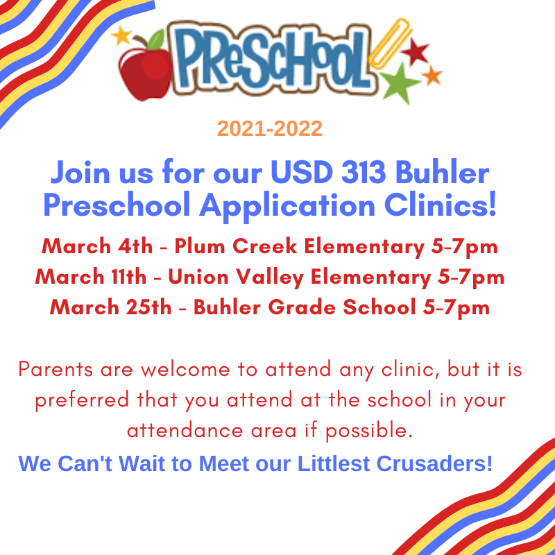 Posted on March 4, 2021, Edited March 4, 2021 by Kayla Simmons USD 313 Preschool Application Clinic Is Here! https://cdn.townweb.com/buhlerks.org/wp-content/uploads/2021/03/Buhler-Preschool-Application-Clinic-FAQ-2-1.pdf