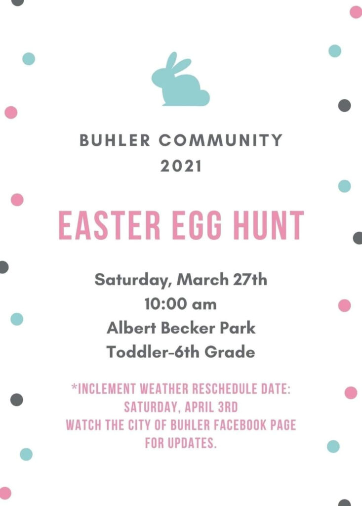 Posted on March 12, 2021, Edited March 12, 2021 by Kayla Simmons Buhler Community Easter Egg Hunt Saturday, March 27th, 10am @ Becker Park for toddlers through 6th grade!