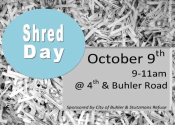 Shred Day Posted on September 1, 2021 It’s back! Shred Day will be October 9th, 9-11am @ 4th & Buhler Rd for Buhler residents.